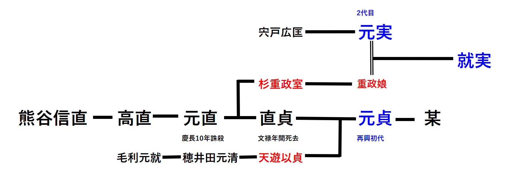 彼は元貞の母と同じ穂田元清の女を 母とし、さらにその妻に元貞の叔母が嫁した杉重政の女を迎えたので熊谷家の血脈を伝えることになった。